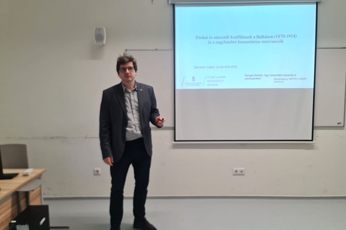 Demeter Gábor, intézetünk tudományos főmunkatársa a Nemzeti Közszolgálati Egyetemen tartott előadást 2025. február 27-én, Etnikai és etnicizált konfliktusok a Balkánon (1870–1914) és a nagyhatalmi humanitárius intervenciók címmel.
